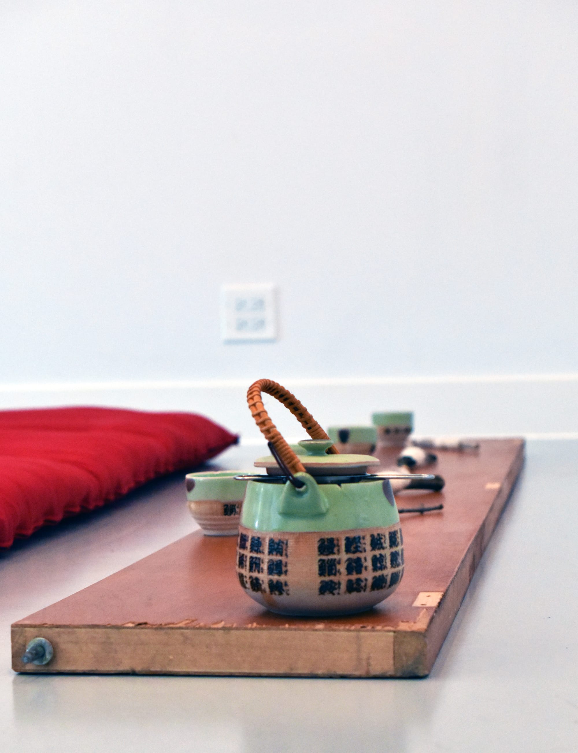 [FROM TOP LEFT TO BOTTOM RIGHT] A red cushion for guests, kettle and cups. A black kettle and raw wool-wrapped twig and mason jar. Mijares pouring tea at the start of the performance. Guests lifting their tea during Mijares' meditation. Guests after placing their twigs in the fire, the conclusion of Mijares' performance. | NaBeela Washington/15 West