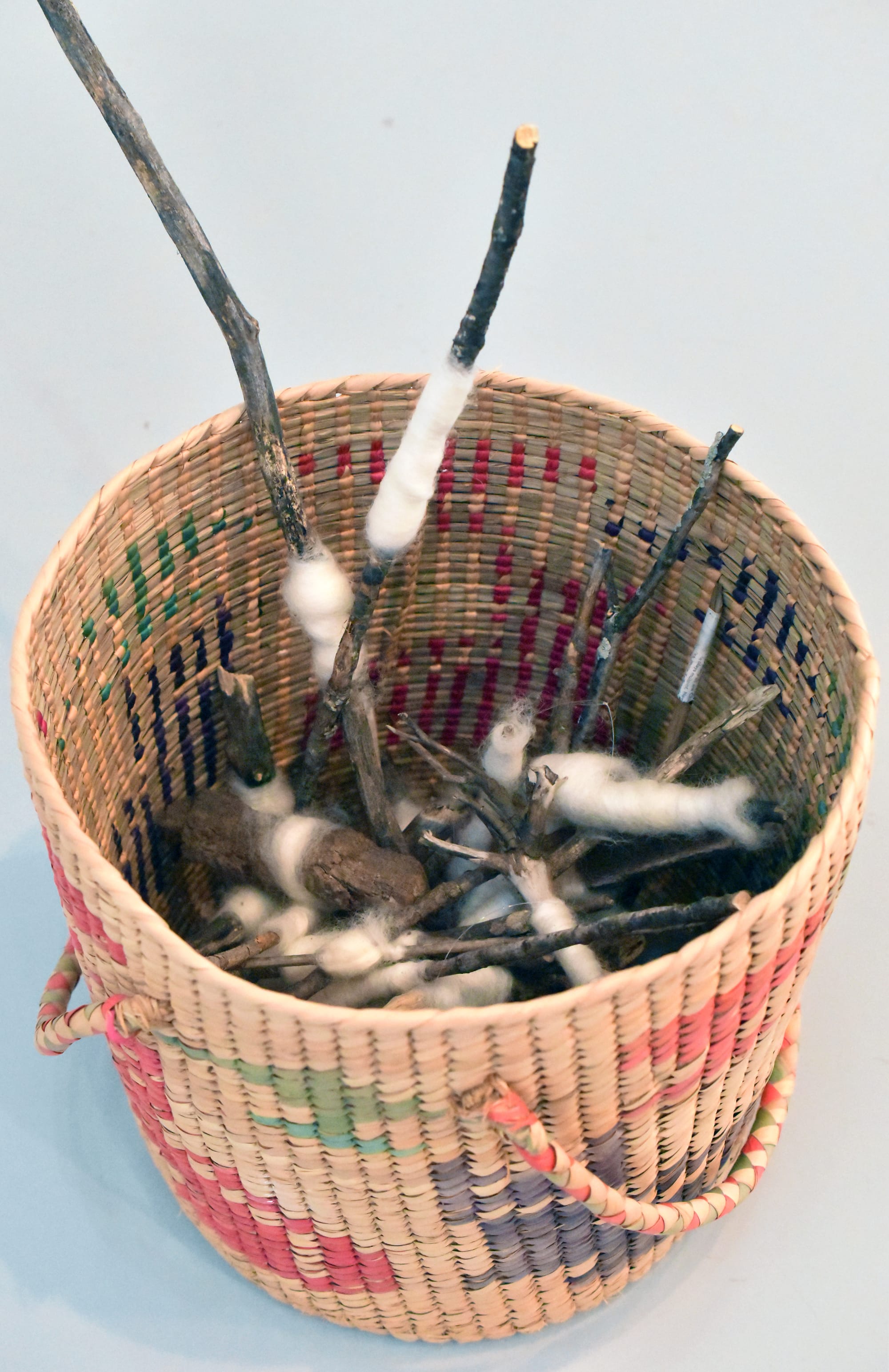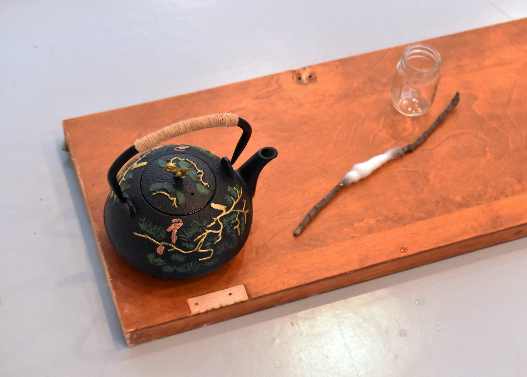 [LEFT] Kettle and cups adorn a wide wooden plank ahead of Mijares' performance. [CENTER] A basket of raw wool-wrapped twigs. [RIGHT] A black kettle used to serve and welcome the audience into Mijares performance. | NaBeela Washington/15 West