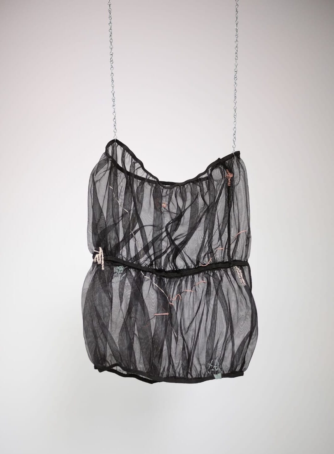 What's on View: A textile piece, consisting of nylon mesh, embroidery floss, beads, chains, and lag screw hook, is on display in front of the gallery; the piece is accompanied by a video of the October 19 opening performance (approximately 25 minutes).