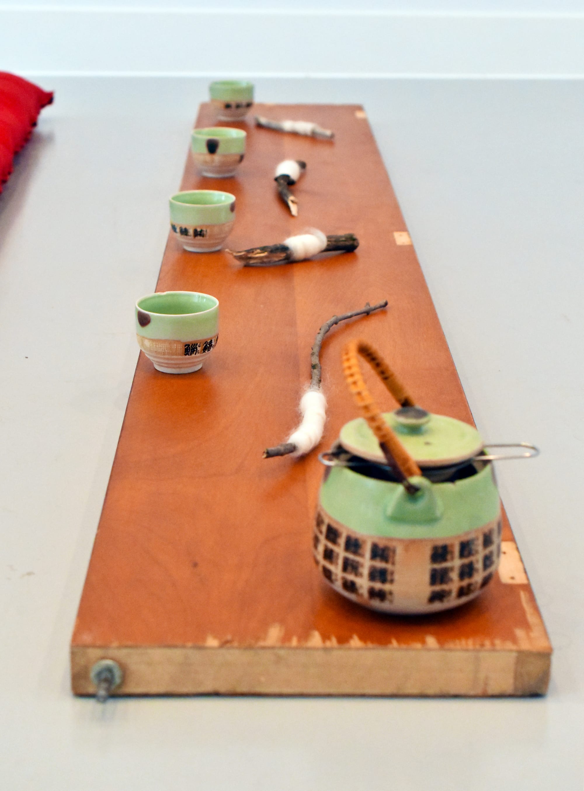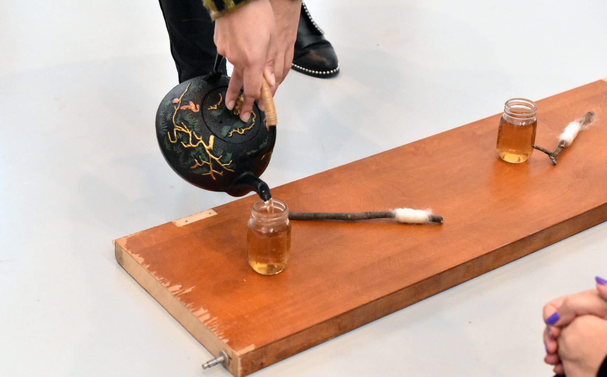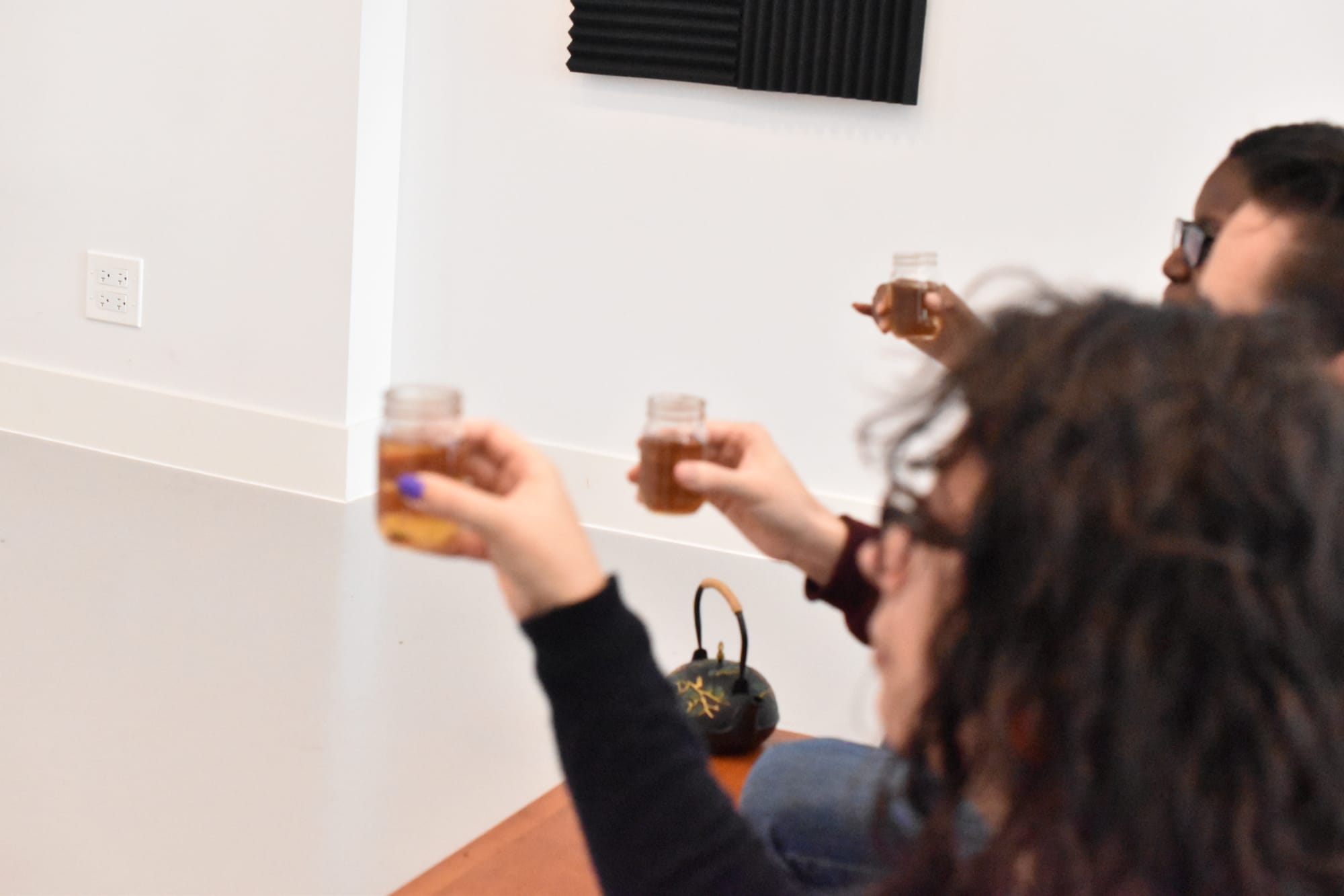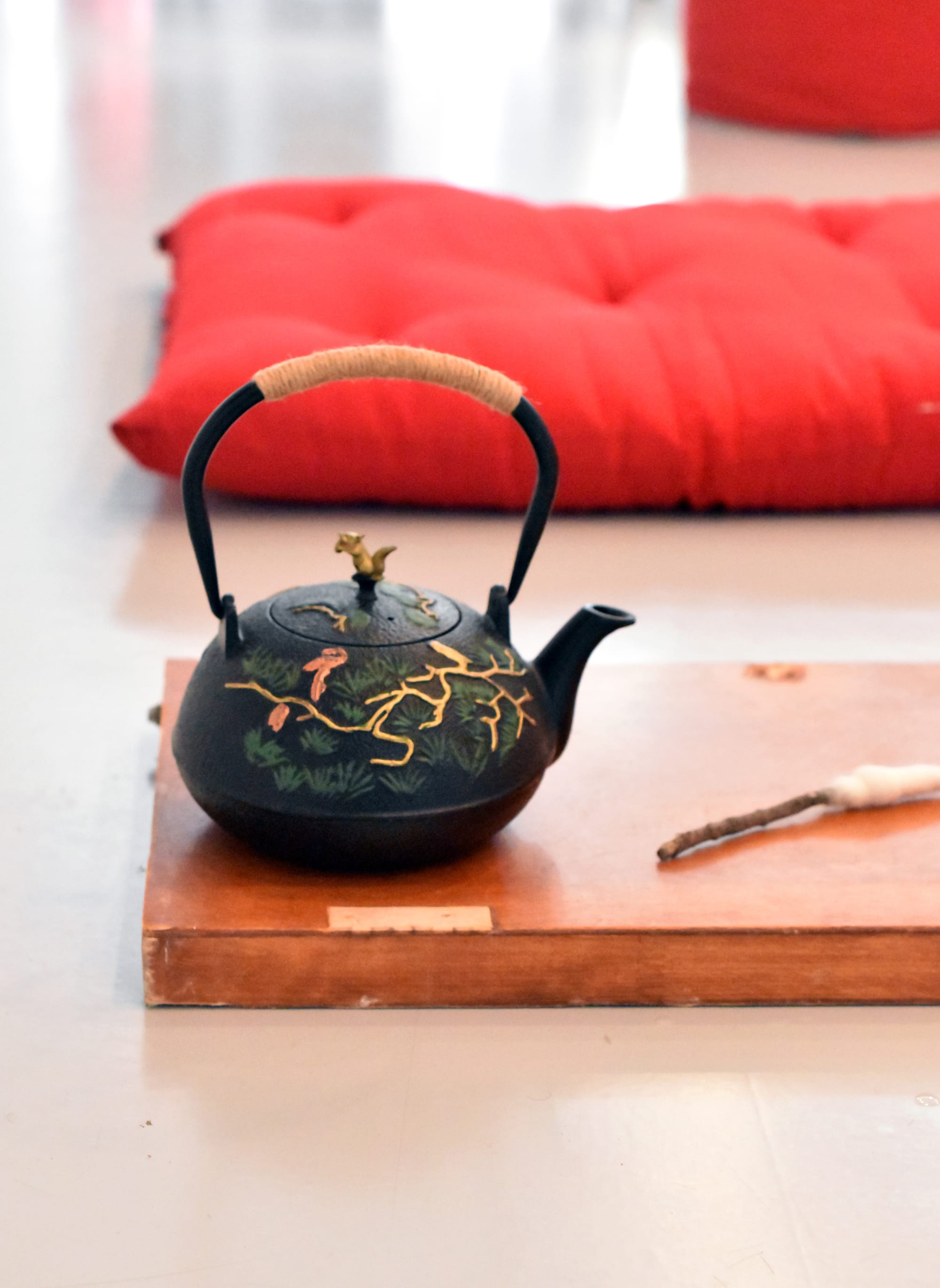 [DE ARRIBA A LA IZQUIERDA A ABAJO A LA DERECHA] Un cojín rojo para invitados, tetera y tazas. Una tetera negra, una ramita envuelta en lana cruda y un tarro de cristal. Mijares sirviendo té al comienzo de la actuación. Invitados levantando su té durante la meditación de Mijares. Invitados después de colocar sus ramitas en el fuego, conclusión de la actuación de Mijares. | NaBeela Washington/15 Oeste
