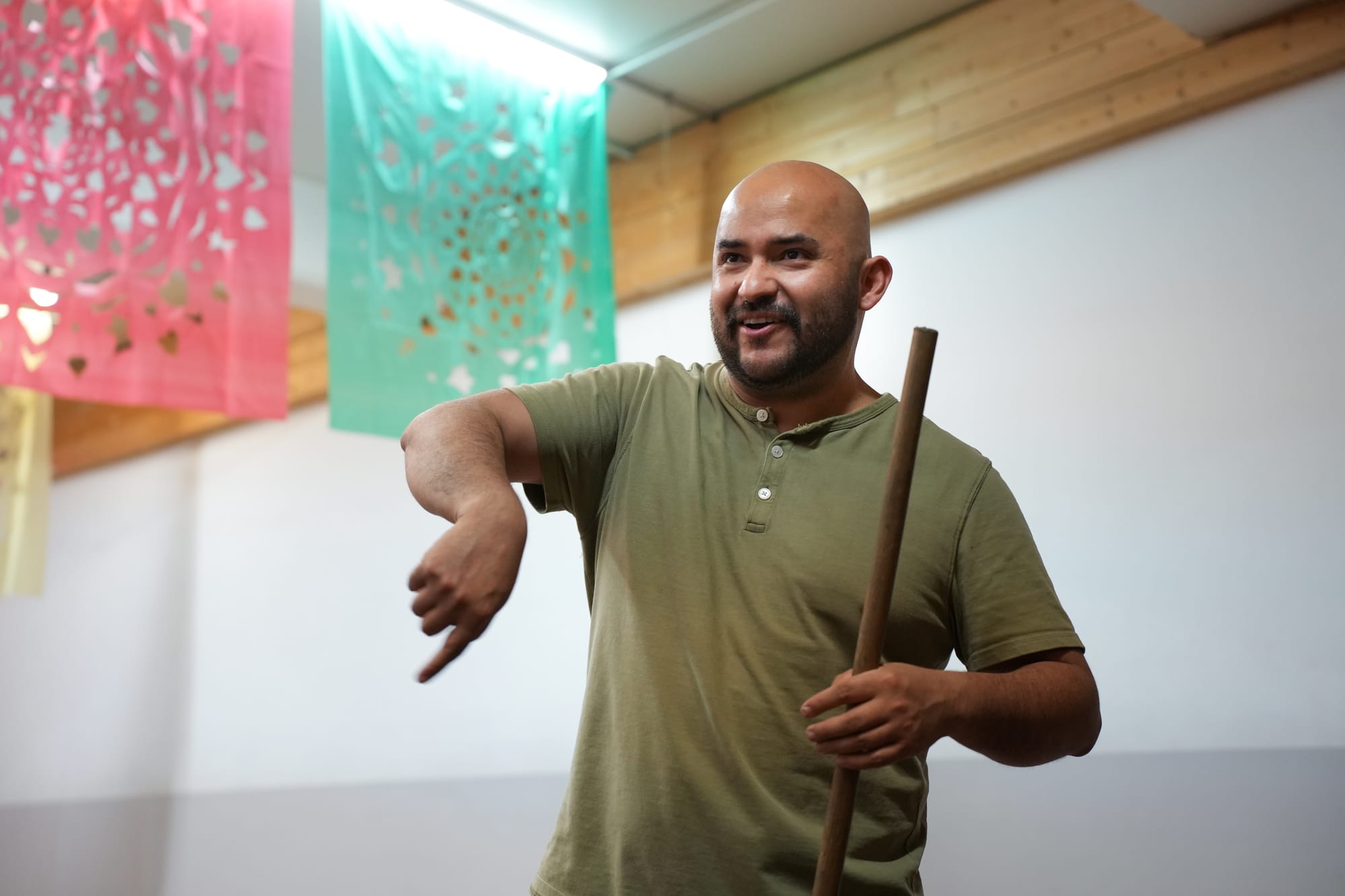 Uno de esos instructores es Ari Cervantes, director musical del CICA de Xalapa, Veracruz (México). Durante el ensayo, guió a los bailarines en sus giros con el rápido rasgueo de su jarana jarocha, un pequeño instrumento parecido a la guitarra de su estado natal. Cervantes, que lleva siete años trabajando con el CICA, afirma que la música puede servir de guía.